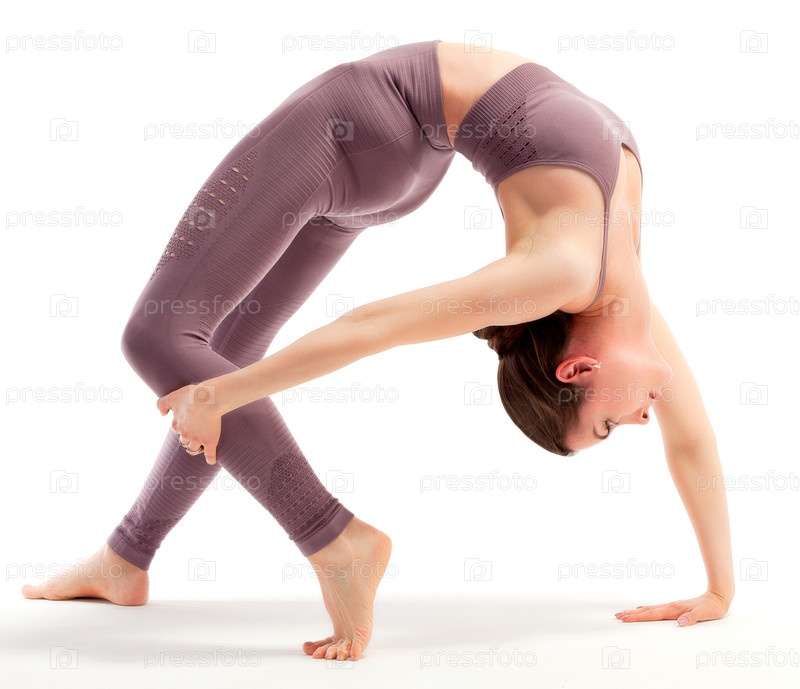 Молодая женщина, занимающаяся йогой на белом фоне, изолирована