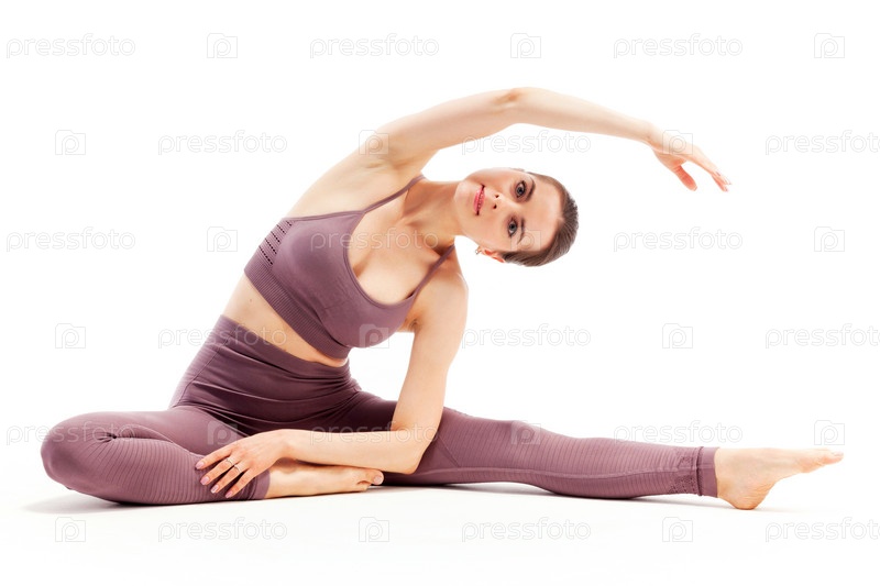 Молодая красивая женщина-йога позирует в студии на белом фоне