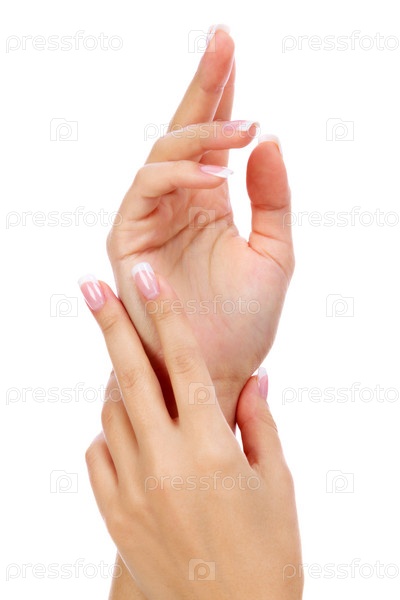 Массивный снимок женских рук с французским маникюром и чистой и мягкой кожей на белом фоне, изолированный