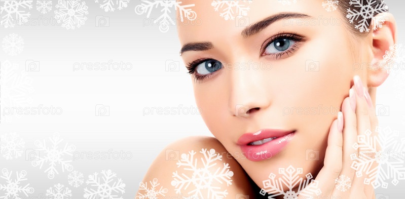 Закрытый портрет красивой женщины с красивым лицом и чистой гладкой мягкой кожей, мягким макияжем. Серый стальной фон со снежинками и место для вашей информации