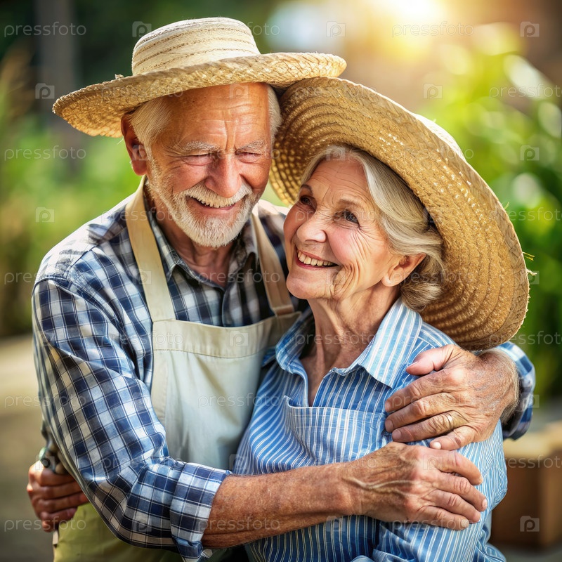 Пожилая пара обнимается в саду. Генерирующий ИИ