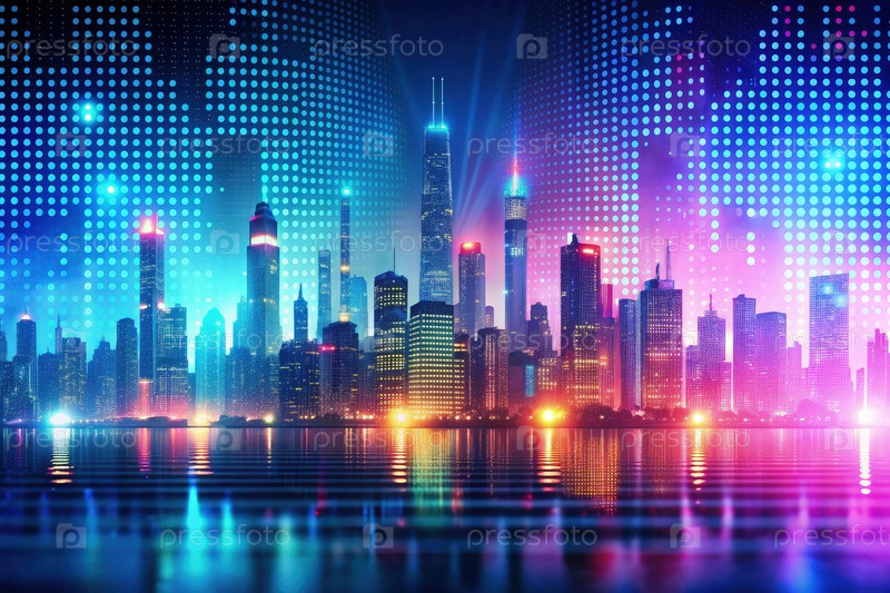 Яркий ночной пейзаж города освещен. Генерирующий ИИ