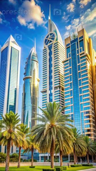 Городской пейзаж с высокими зданиями и пальмовыми деревьями. Генерирующий ИИ