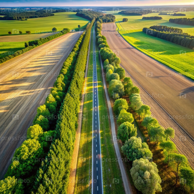 Вид с воздуха на шоссе, прорезающее поле. Генерирующий ИИ