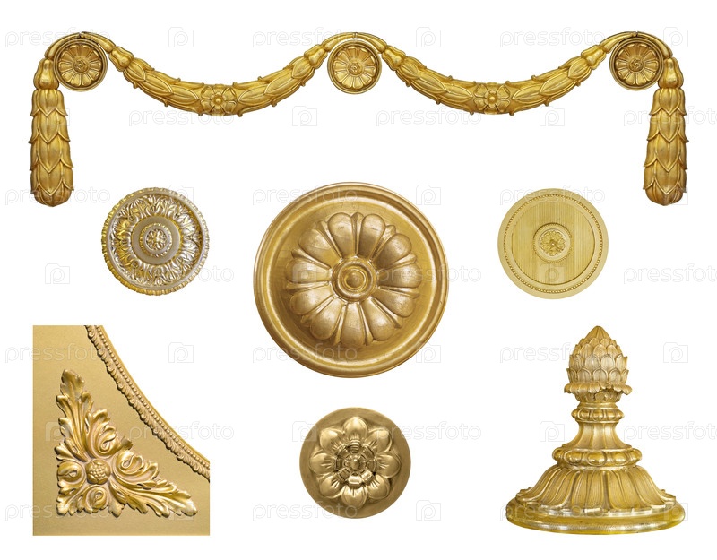Золотой декоративный элемент с цветочным рисунком, выделенным на белом фоне