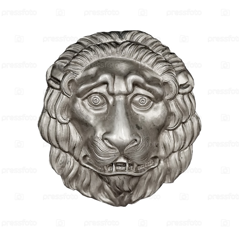 Декоративный элемент в виде серебряной львиной головы изолирован на белом фоне