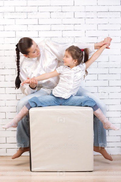 Мама и дочка в джинсах и белой рубашке