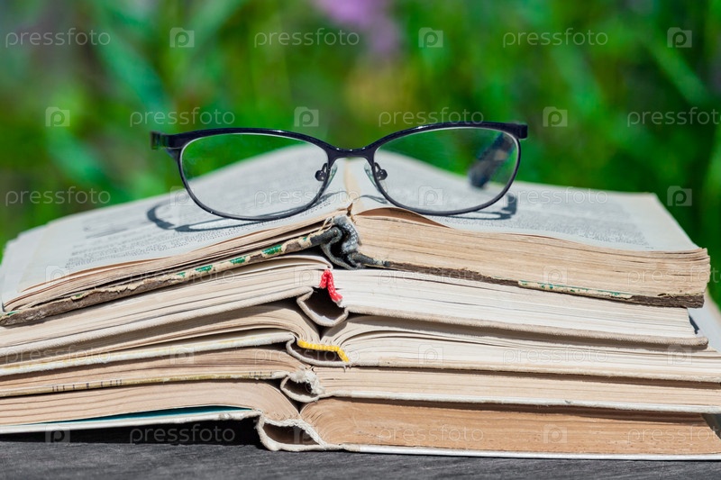Открытая книжная стопка и очки на них лежат на деревянном столе на фоне природы