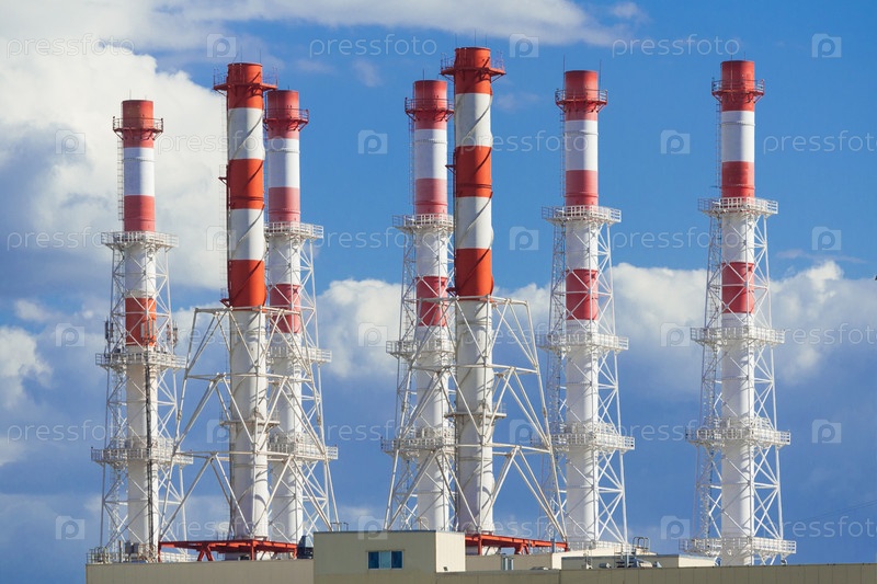 Промышленные дымоходы на фоне голубого неба