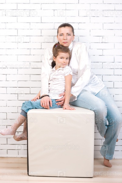 Мама и дочка в джинсах и белой рубашке