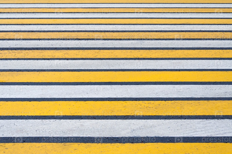Вид желто-белой разметки пешеходных линий на асфальтовой дороге (фон, текстура)