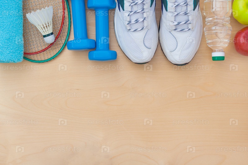 Атрибуты здорового образа жизни: питание, спорт или снаряжение спортсмена на деревянной поверхности. Плоский вид с пространством для копирования