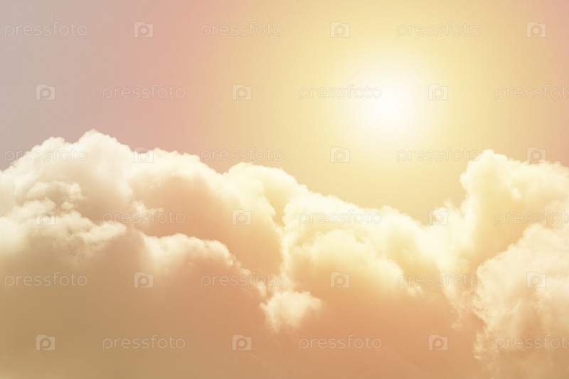 Пушистые облака, освещенные солнцем на фоне оранжевого неба (фон, тонированный)
