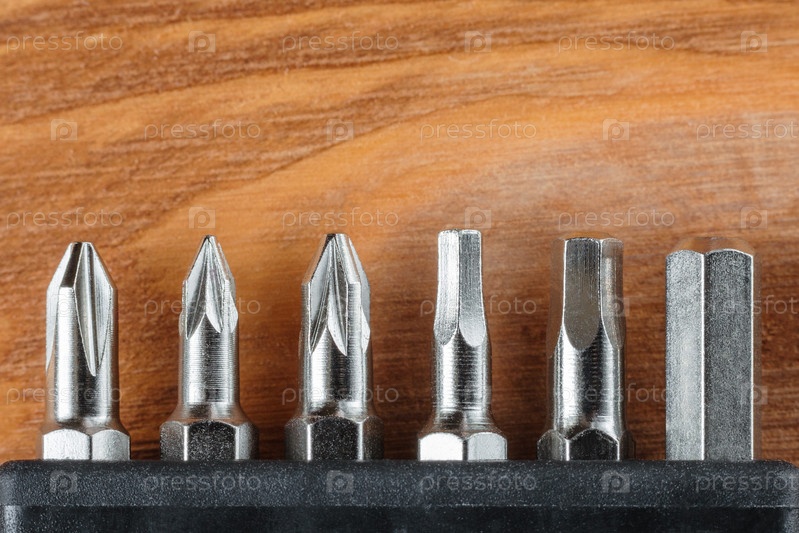 Набор инструментов из головок для отвертки (битов) на деревянном столе с копировальным пространством (плоская укладка)