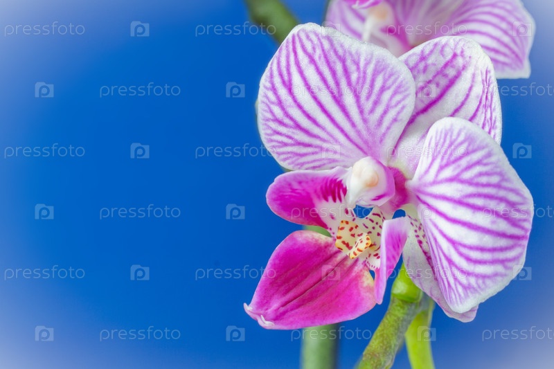 Вид на розово-белый цветок орхидеи Phalaenopsis с пространством для копирования на синем фоне