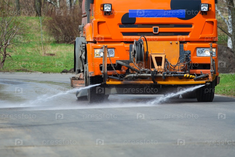 Передний вид оранжевого грузовика для мытья уборки дороги в парке