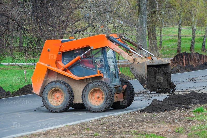 Маленький бульдозер разгружает чернозем. Работы по развитию парковой зоны