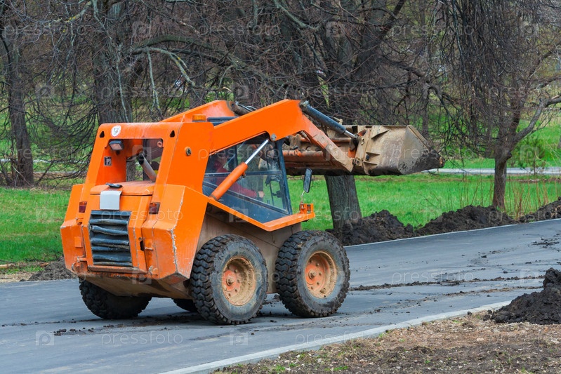 Рулевой грузовик Orange Skid находится на дороге.Работы по благоустройству парковочной зоны