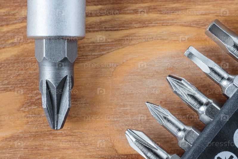 Набор голов (битов) и отвертка на деревянном столе (плоский лежал). Угловое расположение