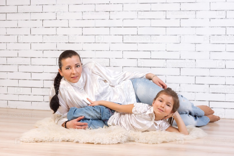 Мать и дочь лежат на меховом ковре дома