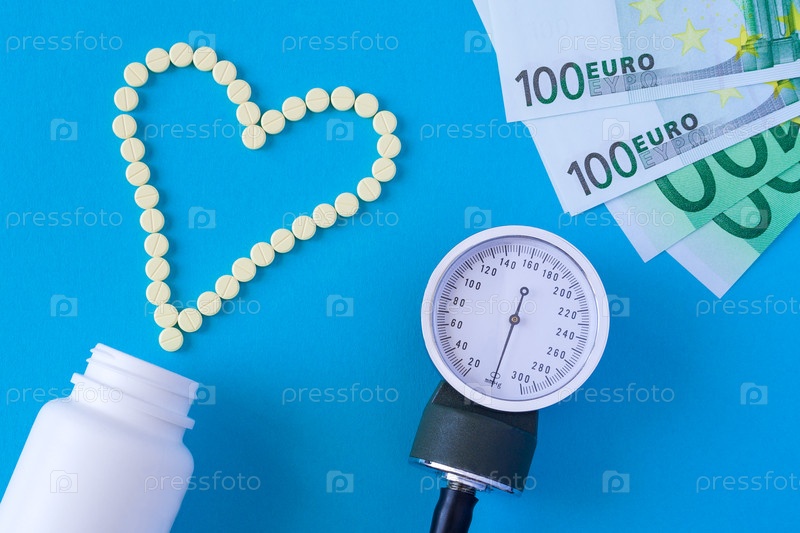 Желтые таблетки выкладываются в виде сердца, белой банки, тонометра артериального давления и купюры в сто евро на синем фоне (концепция, плоская кладка)