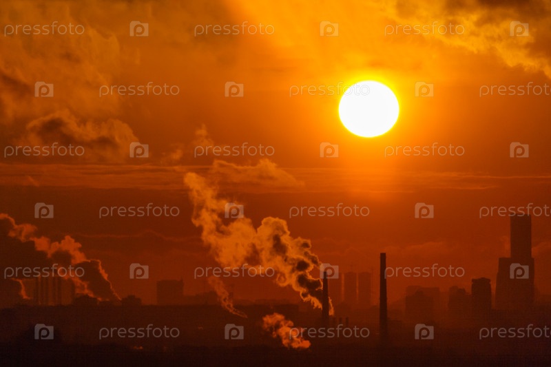 Закат или восход солнца на фоне города и дымовые трубы