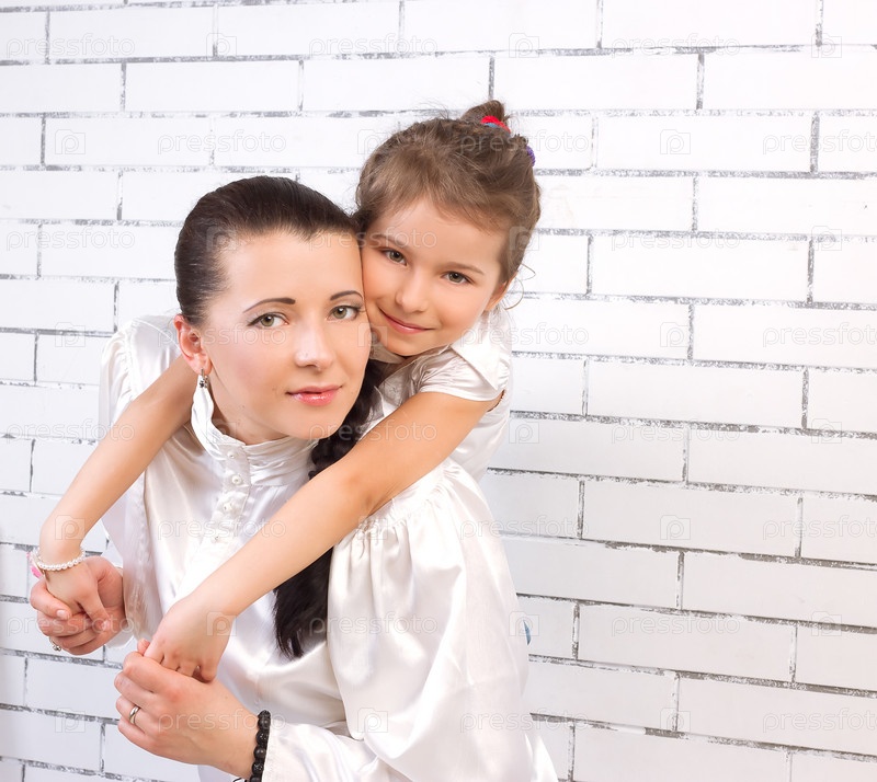 Дочь в белом платье нежно обнимает маму