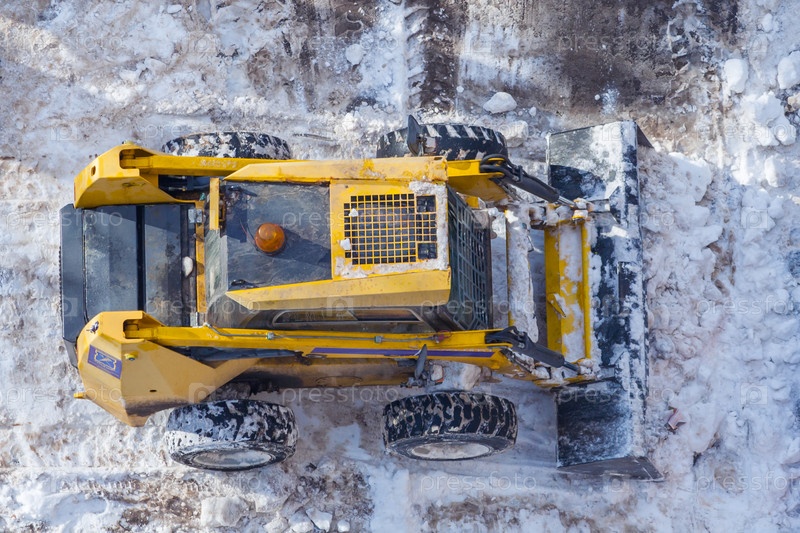 Вид сверху на желтый снегоуборочный снегоочиститель с дороги