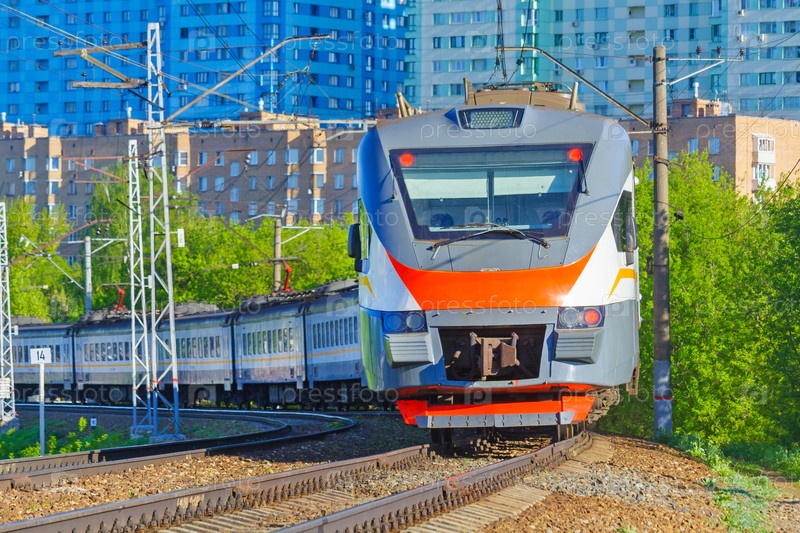 Пассажирский электропоезд движется на фоне зеленых деревьев и городских домов