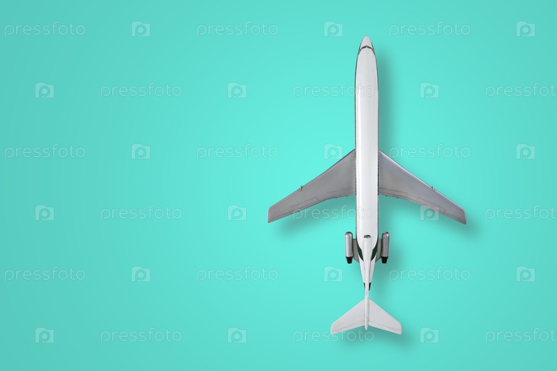 Верхний вид модели самолета с тенью на бирюзовом фоне (копировальное пространство, плоская лежанка)