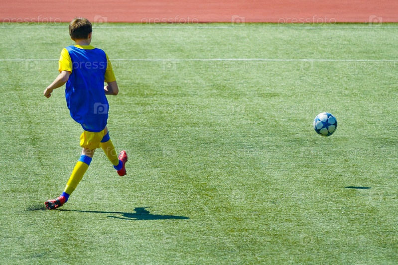 Футбольный матч, молодой игрок делает удар по мячу