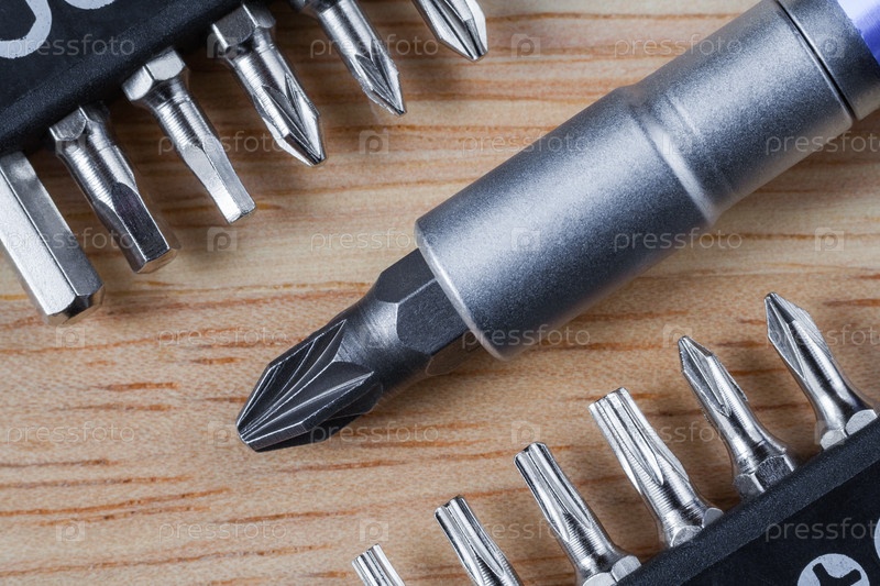 Набор голов (бит) и отвертка на деревянном столе (Плоская укладка)