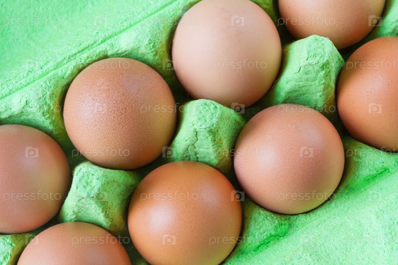 Вид на коричневые куриные яйца в зеленой картонной коробке (закрыть)