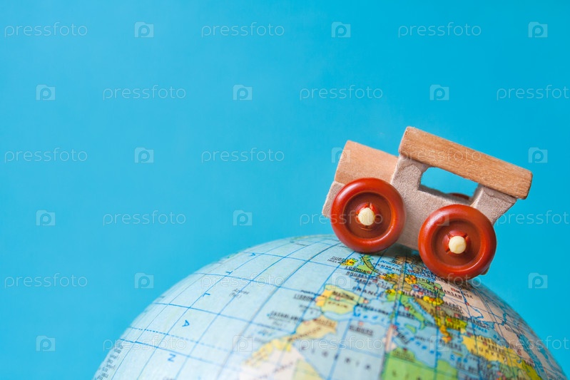 Деревянный игрушечный автомобиль на глобусе на лазурном фоне с копирайтом. Концепция туризма, путешествий