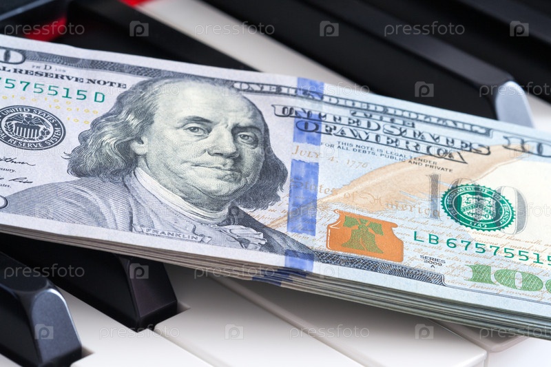 Закрыть вид на стодолларовые банкноты на фортепианной клавиатуре (концепция)