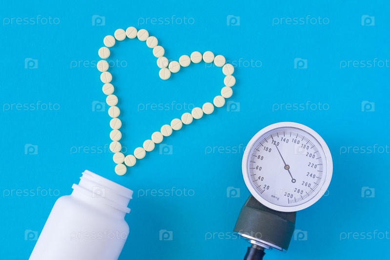 Желтые таблетки выкладываются в виде сердца, белой банки и тонометра артериального давления на синем фоне (концепция, плоская кладка)