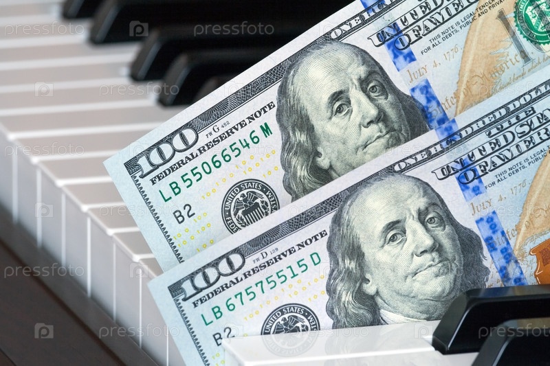 Вид фрагмента двух стодолларовых банкнот, новый образец, вставленный в клавиши фортепиано (концепция)