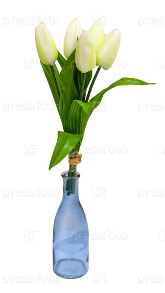 Букет из светло-желтых тюльпанов в стеклянной бутылке, изолированной на белом фоне