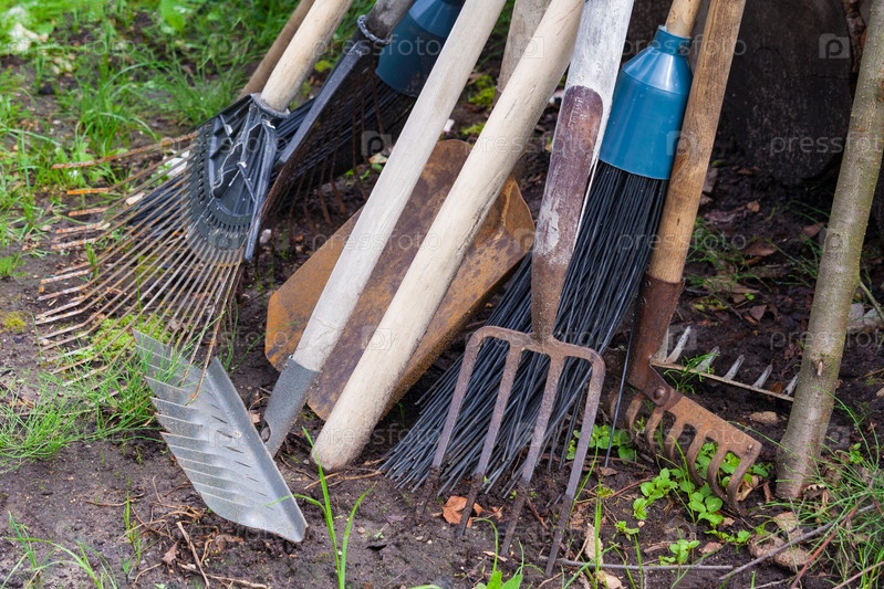 Старые грязные садовые инструменты (культиватор, лопата, грабли)