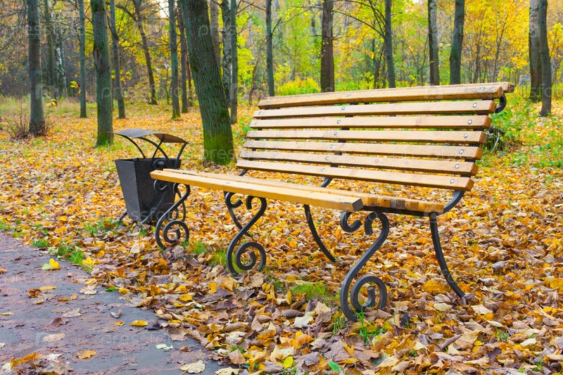 Деревянная скамейка и мусорный бак в осеннем парке