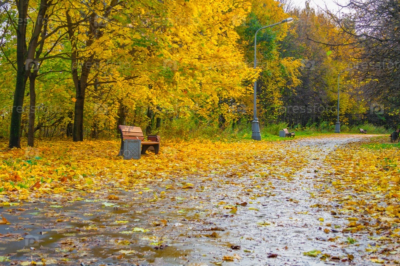 Вид на асфальтовую дорогу, усыпанную желтыми листьями в осеннем парке со скамейками и фонарями