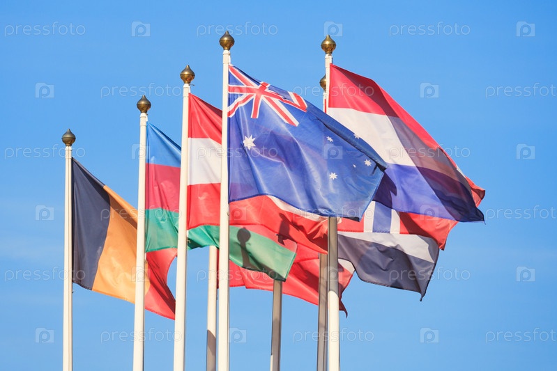 Флаги разных стран развеваются на ветру на фоне ярко-голубого неба