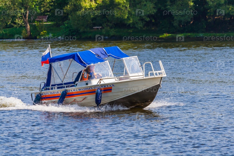 Россия, Москва, сентябрь 2017 года. Лодка спасательной службы на воде со спасателем-человеком. (Редакция. Надпись на лодке "Спасательная служба на водных объектах"