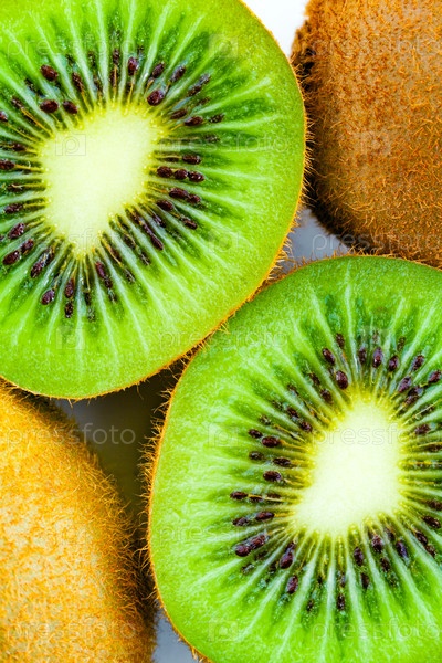 Закрыть вид на кучу фруктов киви, целые и половинки (фон)