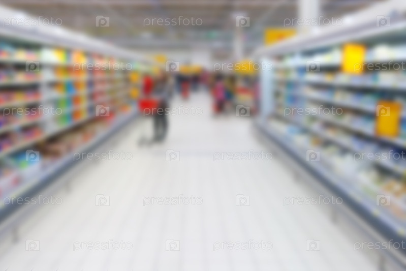 Перспективный вид размытого интерьера крупного супермаркета с потребителями (фон)