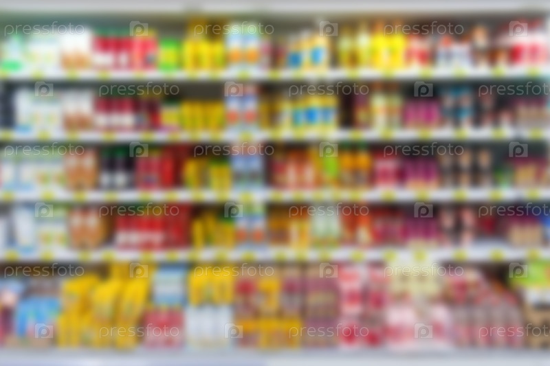Закрыть вид на полку с продуктами питания в супермаркете (размытый, фон)