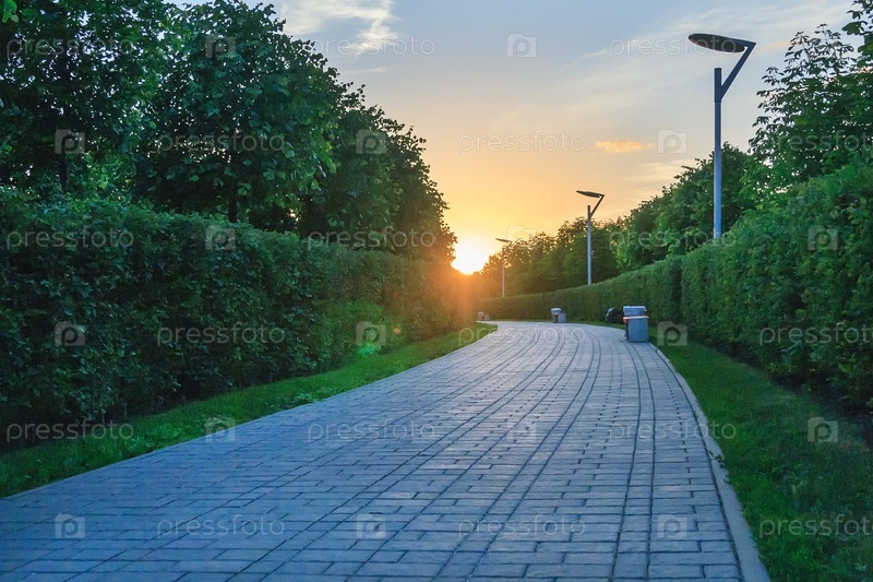 Перспективный вид пешеходной дорожки в вечернем парке на фоне заката