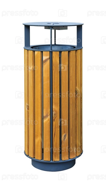 Деревянный мусорный бак с металлической тушой, выделенной на белом фоне (элемент дизайна)