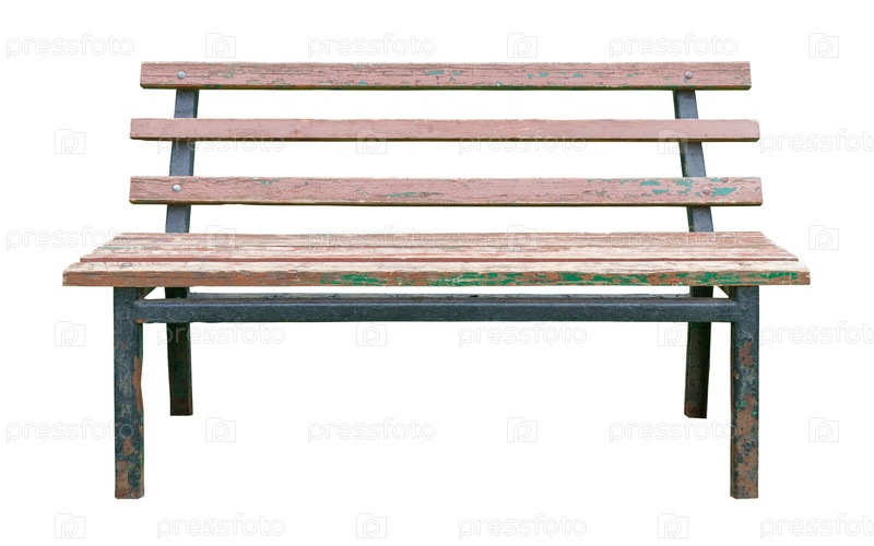 Стареющая потертая деревянная скамейка с металлическими ножками, изолированными на белом фоне (элемент дизайна)