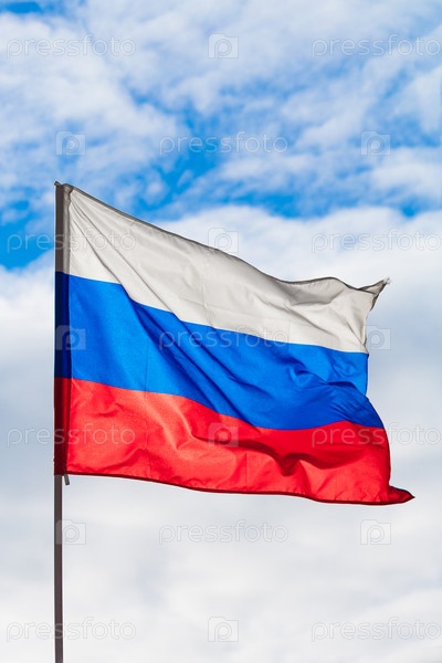 Флаг Российской Федерации развевается на ветру на фоне голубого неба и облаков